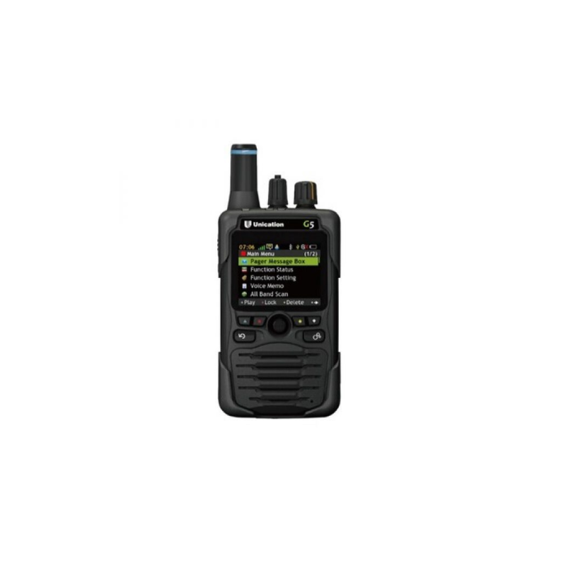 The Unication G5 is a dual-band P25 voice pager that supports analog 2-tone and P25 trunked or conventional systems. Designed for public safety, the G5 delivers reliable alerting across multiple systems with rugged IP67 protection.
